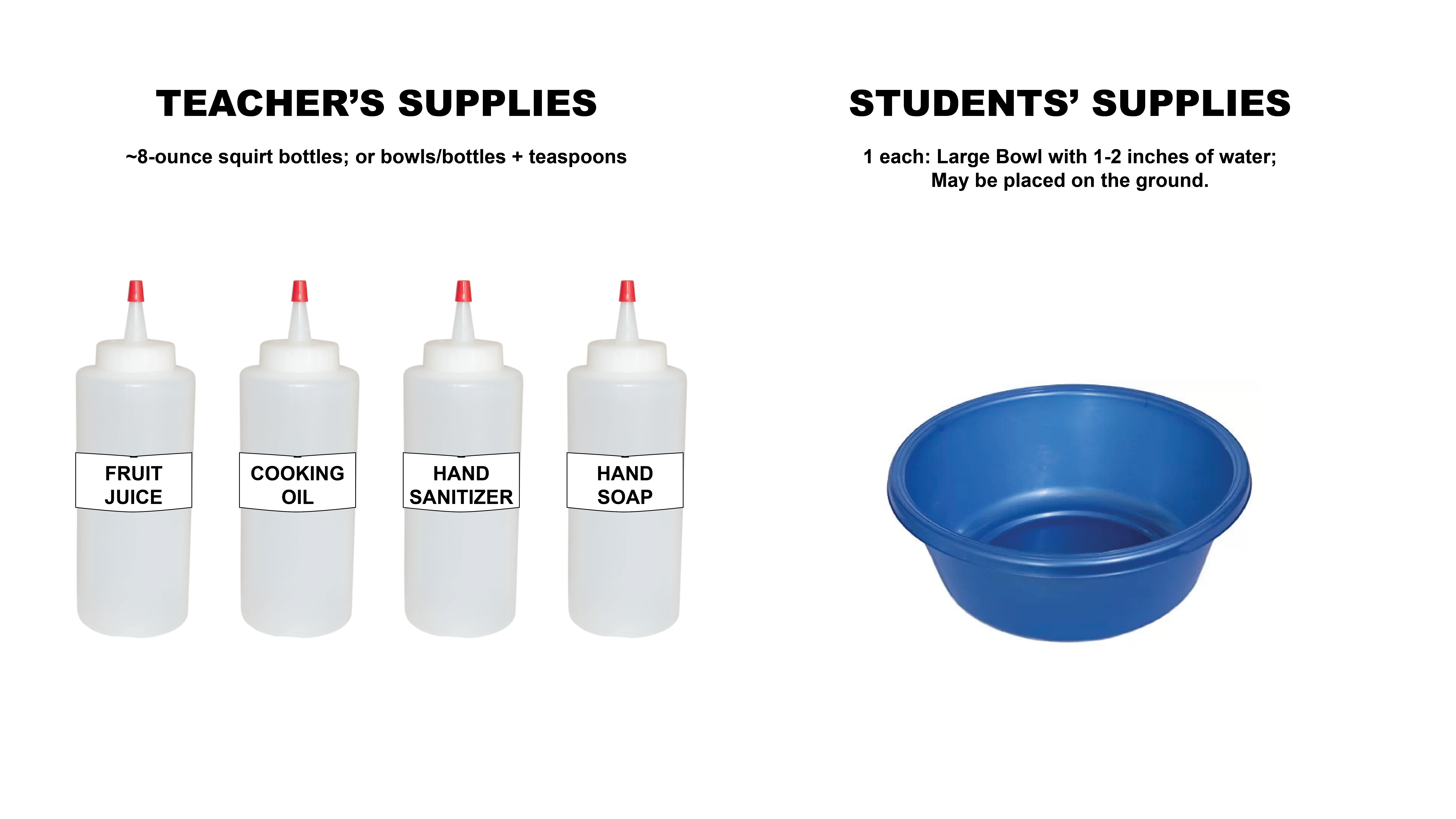 - If using bowls/basins, have each student collect on basin, and fill it with 1-2" of water, and return to desk. If desired, bowl/basin may be placed on floor, rather than on desk.